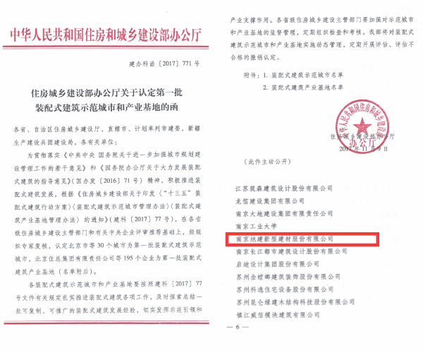 2017年11月9日,住房城鄉(xiāng)建設(shè)部辦公廳印發(fā)《關(guān)于認(rèn)定第一批裝配式建筑示范城市和產(chǎn)業(yè)基地的函》,南京旭建公司成為第一批按照《裝配式建筑產(chǎn)業(yè)基地管理辦法》認(rèn)定的國家“裝配式建筑產(chǎn)業(yè)基地”。
